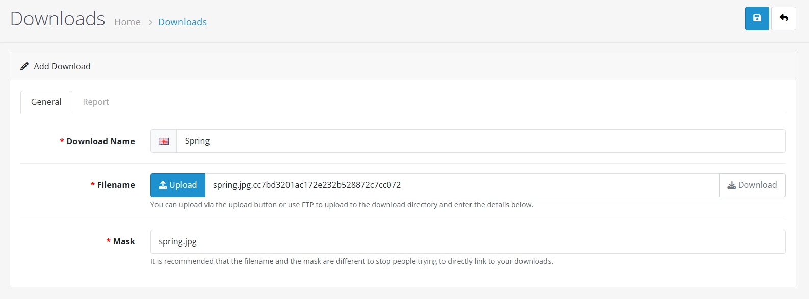 To insert a new download, you must give the downloadable product a name, upload the file, and set an allowance for the number of downloads per customer. The mask option allows the administrator to give the file a different visible filename. Press "Save" to submit the download information and save it.